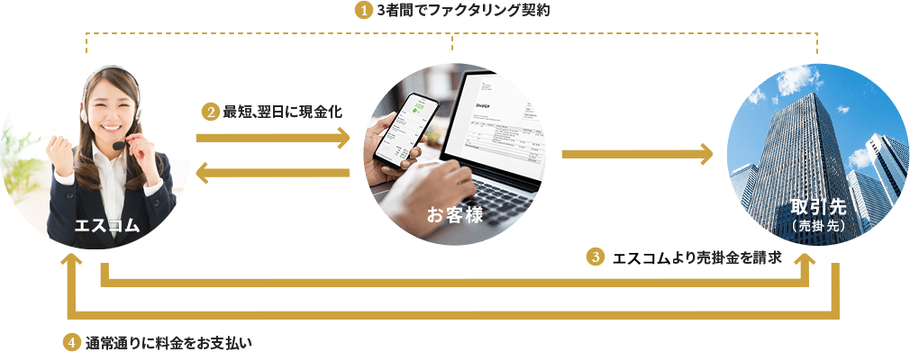 お客様と売掛先様、当社の3社間での契約となります